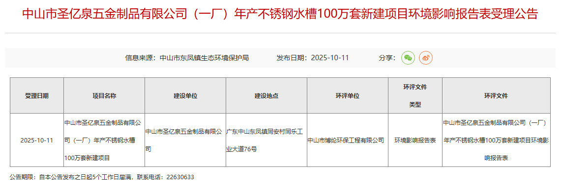 2025年10月11日,中山市東鳳鎮生態環境保護局受理中山市圣億泉五金制品有限公司(一廠)年產不銹鋼水槽100萬套新建項目環境影響報告表并對外進行公告,公告期:5個工作日。