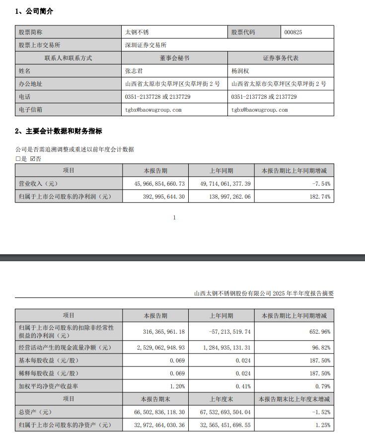 8月29日晚,太鋼不銹(000825)發(fā)布2025年半年度業(yè)績報(bào)告。報(bào)告期內(nèi),公司實(shí)現(xiàn)營業(yè)收入459.67億元,實(shí)現(xiàn)歸屬于上市公司股東的凈利潤3.93億元,同比大增182.74%;歸屬于上市公司股東的扣非凈利潤3.16億元,相較2024年同期的-5721.35萬元,不僅實(shí)現(xiàn)扭虧為盈且增幅達(dá)652.96%。
