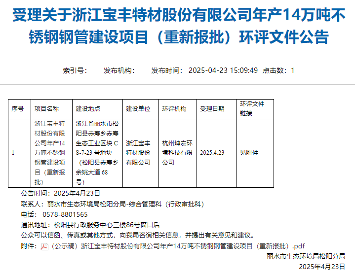 2025年4月23日,麗水市生態(tài)環(huán)境局松陽(yáng)分局受理浙江寶豐特材股份有限公司年產(chǎn)14萬(wàn)噸不銹鋼鋼管建設(shè)項(xiàng)目(重新報(bào)批)環(huán)評(píng)文件并對(duì)外進(jìn)行公告。