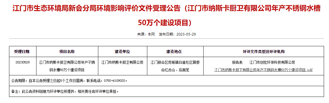 5月29日,江門市生態(tài)環(huán)境局新會(huì)分局受理江門市納斯卡廚衛(wèi)有限公司年產(chǎn)不銹鋼水槽50萬個(gè)建設(shè)項(xiàng)目環(huán)境影響評(píng)價(jià)文件并對(duì)外進(jìn)行公告,公告期:5個(gè)工作日。