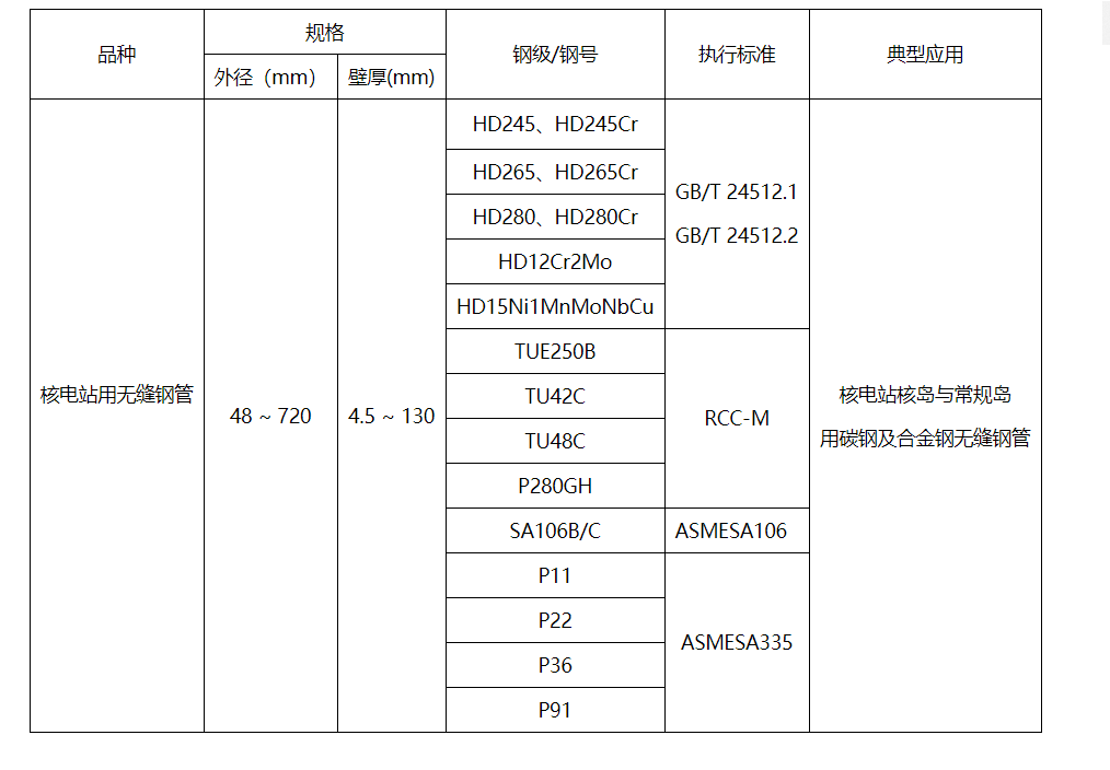 核電用管執行GB/T 24512.1、GB/T 24512.1、RCCM 系列、ASME系列標準。可生產外徑≤273mm規格核2、3級鋼管,用于常規的主蒸汽管道和主給水管道。