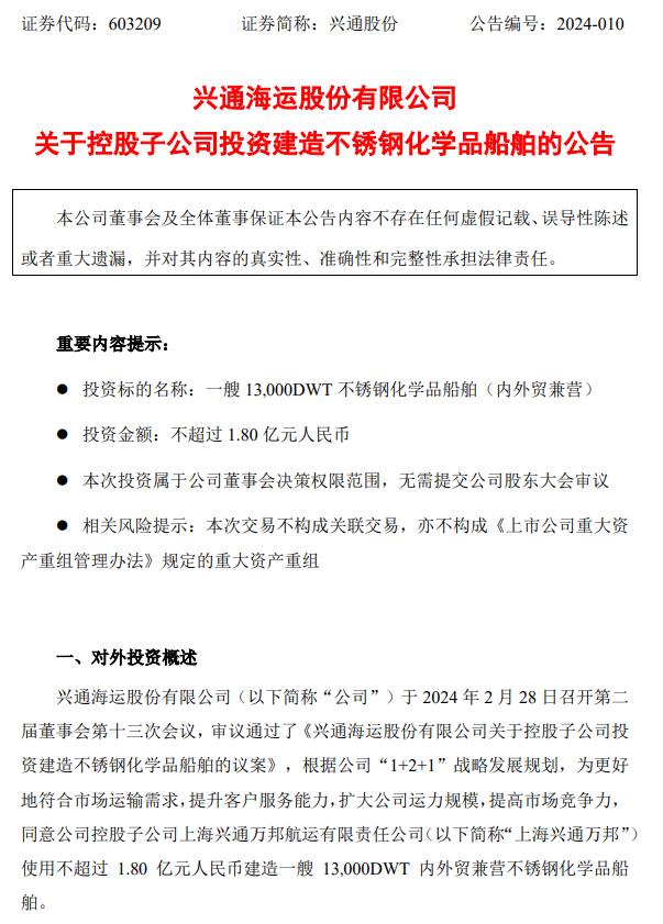 (來源:《興通股份:興通海運股份有限公司關于控股子公司投資建造不銹鋼化學品船舶的公告》)